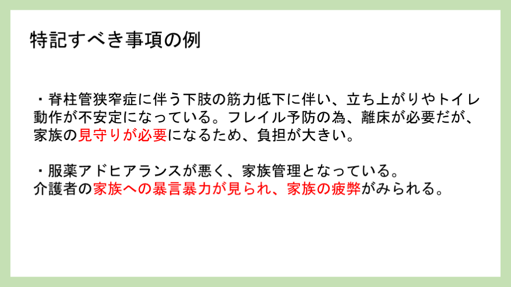 介護者の家族への暴言暴力が見られ、家族の疲弊がみられる。 特記すべき事項の例