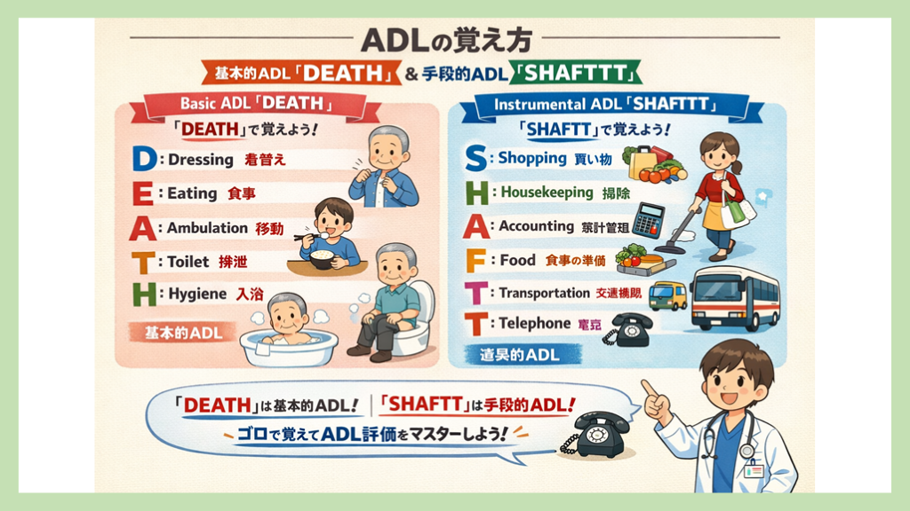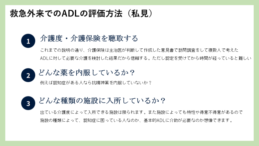 施設の種類によって、認知症に困っている人なのか、基本的ADLに介助が必要なのか想像できます。 救急外来でのADLの評価方法(私見)