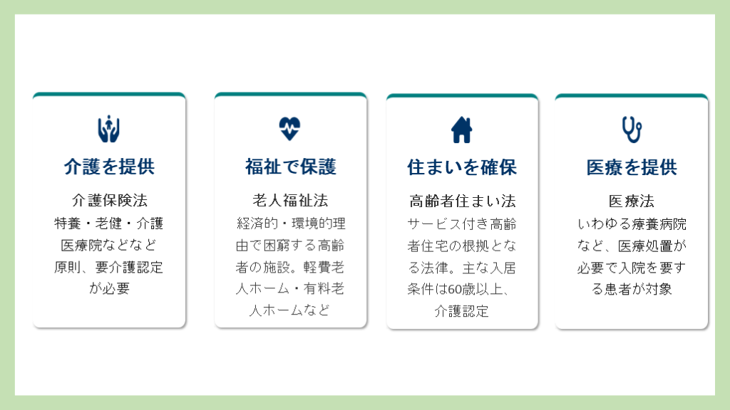 いわゆる療養病院など、医療処置が必要で入院を要する患者が対象 福祉で保護 老人福祉法 経済的・環境的理由で困窮する高齢者の施設。軽費老人ホーム・有料老人ホームなど