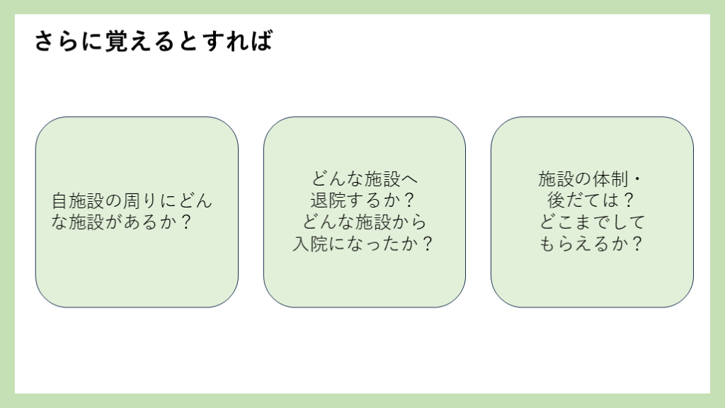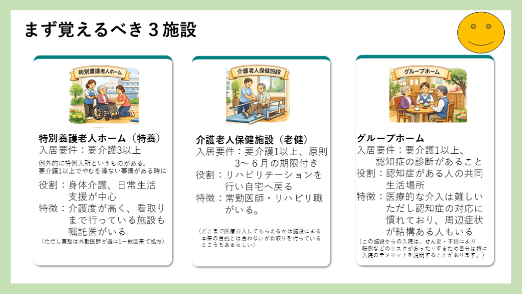 →まずは3つ(要介護3以上の特養、要介護1以上リハの老健、認知症→GH) 訪問看護・特別指示書