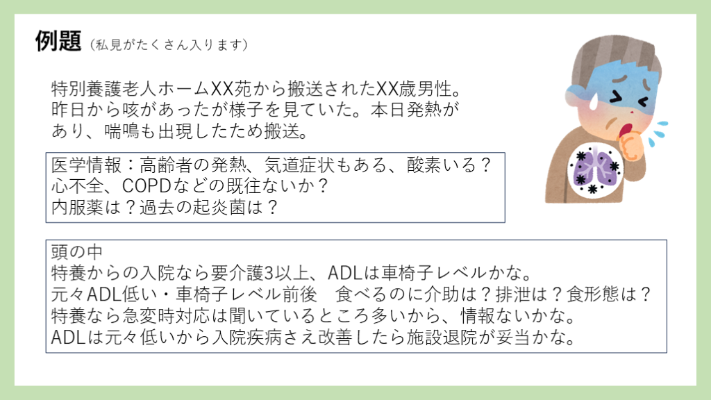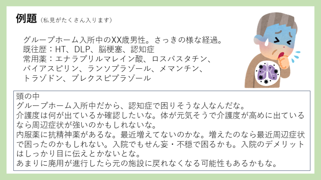 #33. 例題(私見がたくさん入ります) グループホーム入所中のXX歳男性。さっきの様な経過。