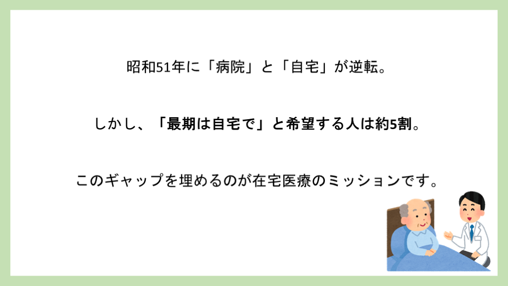 このギャップを埋めるのが在宅医療のミッションです。
