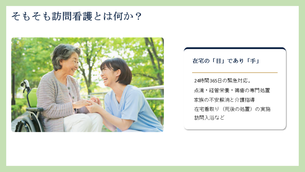 #38. 在宅の「目」であり「手」 24時間365日の緊急対応。 点滴・経管栄養・褥瘡の専門処置 家族の不安解消と介護指導 在宅看取り(死後の処置)の実施 そもそも訪問看護とは何か? 訪問入浴など