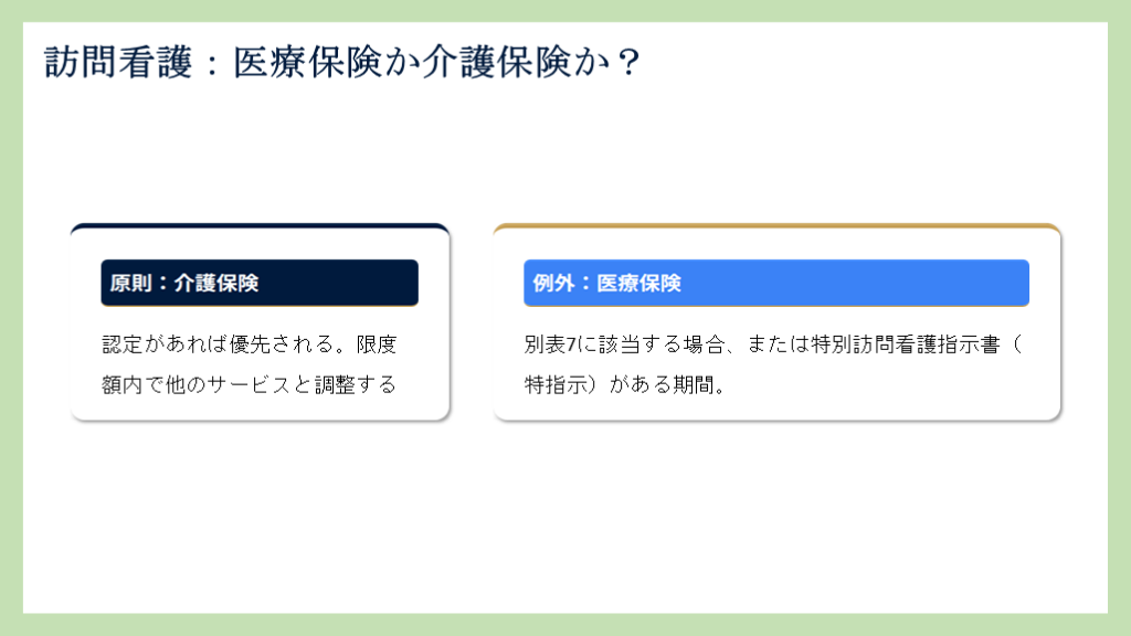 #41. 認定があれば優先される。限度額内で他のサービスと調整する 別表7に該当する場合、または特別訪問看護指示書(特指示)がある期間。 訪問看護:医療保険か介護保険か?