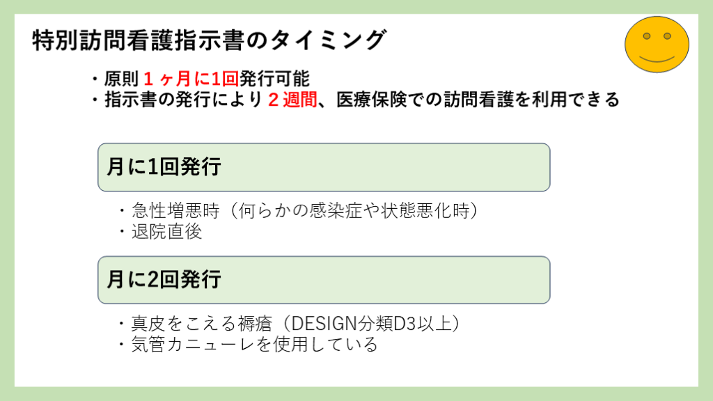 →特別訪問看護指示書を出せるタイミング(退院、増悪、褥瘡、気管カニューレ)