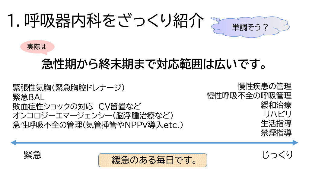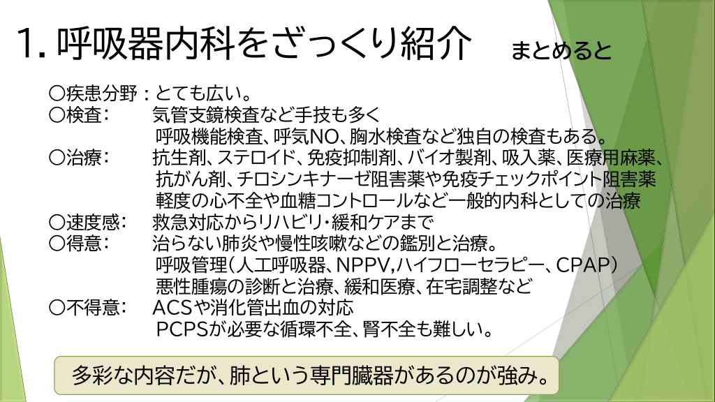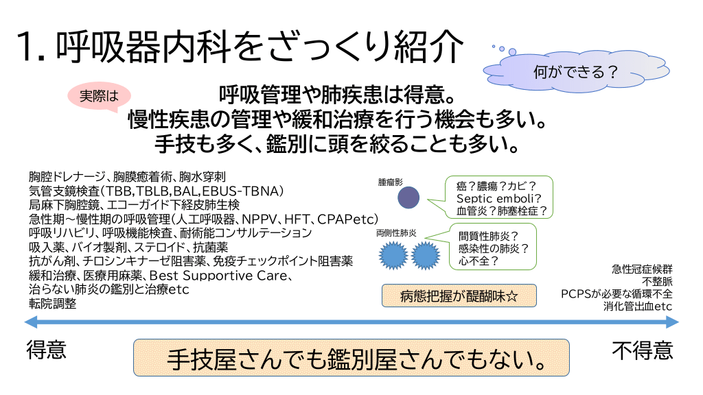 #10. 1.呼吸器内科をざっくり紹介 まとめると ○疾患分野 : とても広い。 ○検査: 気管支鏡検査など手技も多く 呼吸機能検査、呼気NO、胸水検査など独自の検査もある。 ○治療: 抗生剤、ステロイド、免疫抑制剤、バイオ製剤、吸入薬、医療用麻薬、 抗がん剤、チロシンキナーゼ阻害薬や免疫チェックポイント阻害薬 軽度の心不全や血糖コントロールなど一般的内科としての治療 ○速度感: 救急対応からリハビリ・緩和ケアまで ○得意: 治らない肺炎や慢性咳嗽などの鑑別と治療。 呼吸管理(人工呼吸器、NPPV,ハイフローセラピー、CPAP) 悪性腫瘍の診断と治療、緩和医療、在宅調整など ○不得意: ACSや消化管出血の対応 PCPSが必要な循環不全、腎不全も難しい。 多彩な内容だが、肺という専門臓器があるのが強み。