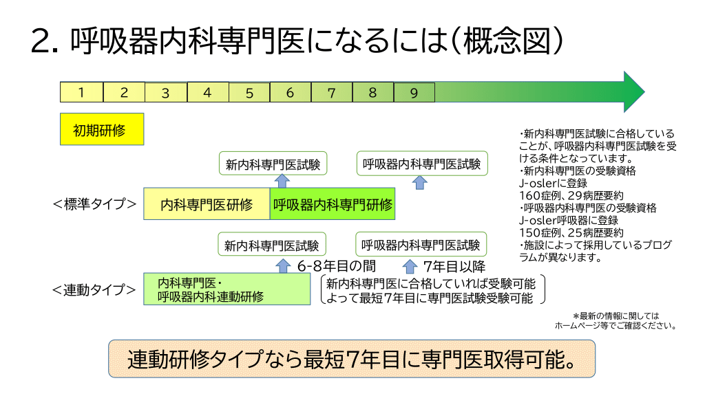 #11. 2. 呼吸器内科専門医になるには(概念図) 1 2 3 4 5 6 7 8 9 初期研修 新内科専門医試験 <標準タイプ> 内科専門医研修 呼吸器内科専門医試験 呼吸器内科専門研修 新内科専門医試験 呼吸器内科専門医試験 6-8年目の間 <連動タイプ> 内科専門医・ 呼吸器内科連動研修 7年目以降 ・新内科専門医試験に合格している ことが、呼吸器内科専門医試験を受 ける条件となっています。 ・新内科専門医の受験資格 J-oslerに登録 160症例、29病歴要約 ・呼吸器内科専門医の受験資格 J-osler呼吸器に登録 150症例、25病歴要約 ・施設によって採用しているプログ ラムが異なります。 新内科専門医に合格していれば受験可能 よって最短7年目に専門医試験受験可能 *最新の情報に関しては ホームページ等でご確認ください。 連動研修タイプなら最短7年目に専門医取得可能。