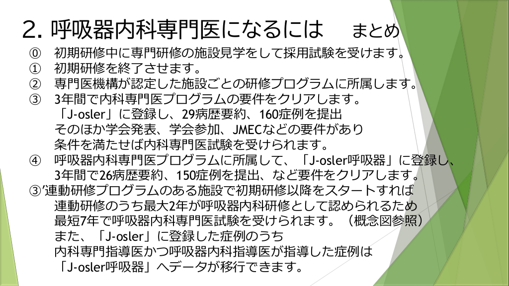 #12. 2. 呼吸器内科専門医になるには ⓪ ① ② ③ まとめ 初期研修中に専門研修の施設見学をして採用試験を受けます。 初期研修を終了させます。 専門医機構が認定した施設ごとの研修プログラムに所属します。 3年間で内科専門医プログラムの要件をクリアします。 「J-osler」に登録し、29病歴要約、160症例を提出 そのほか学会発表、学会参加、JMECなどの要件があり 条件を満たせば内科専門医試験を受けられます。 ④ 呼吸器内科専門医プログラムに所属して、「J-osler呼吸器」に登録し、 3年間で26病歴要約、150症例を提出、など要件をクリアします。 ③’連動研修プログラムのある施設で初期研修以降をスタートすれば 連動研修のうち最大2年が呼吸器内科研修として認められるため 最短7年で呼吸器内科専門医試験を受けられます。(概念図参照) また、「J-osler」に登録した症例のうち 内科専門指導医かつ呼吸器内科指導医が指導した症例は 「J-osler呼吸器」へデータが移行できます。