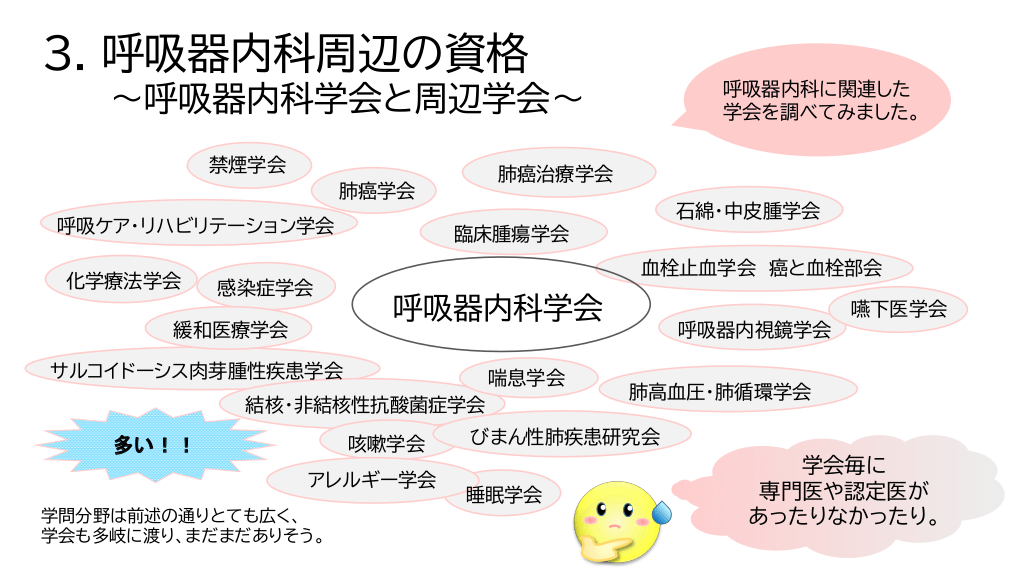 #13. 3. 呼吸器内科周辺の資格 呼吸器内科に関連した 学会を調べてみました。 ~呼吸器内科学会と周辺学会~ 禁煙学会 肺癌治療学会 肺癌学会 石綿・中皮腫学会 呼吸ケア・リハビリテーション学会 化学療法学会 臨床腫瘍学会 血栓止血学会 癌と血栓部会 感染症学会 緩和医療学会 呼吸器内科学会 サルコイドーシス肉芽腫性疾患学会 喘息学会 結核・非結核性抗酸菌症学会 咳嗽学会 多い!! アレルギー学会 学問分野は前述の通りとても広く、 学会も多岐に渡り、まだまだありそう。 嚥下医学会 呼吸器内視鏡学会 肺高血圧・肺循環学会 びまん性肺疾患研究会 睡眠学会 学会毎に 専門医や認定医が あったりなかったり。