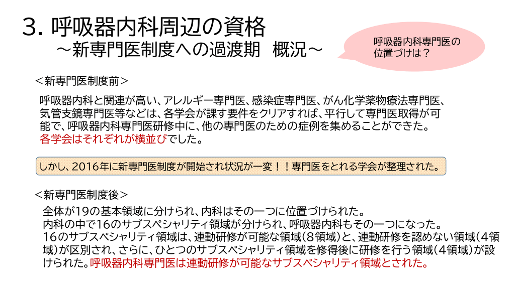 #14. 3. 呼吸器内科周辺の資格 ~新専門医制度への過渡期 概況~ 呼吸器内科専門医の 位置づけは? <新専門医制度前> 呼吸器内科と関連が高い、アレルギー専門医、感染症専門医、がん化学薬物療法専門医、 気管支鏡専門医等などは、各学会が課す要件をクリアすれば、平行して専門医取得が可 能で、呼吸器内科専門医研修中に、他の専門医のための症例を集めることができた。 各学会はそれぞれが横並びでした。 しかし、2016年に新専門医制度が開始され状況が一変!!専門医をとれる学会が整理された。 <新専門医制度後> 全体が19の基本領域に分けられ、内科はその一つに位置づけられた。 内科の中で16のサブスペシャリティ領域が分けられ、呼吸器内科もその一つになった。 16のサブスペシャリティ領域は、連動研修が可能な領域(8領域)と、連動研修を認めない領域(4領 域)が区別され、さらに、ひとつのサブスペシャリティ領域を修得後に研修を行う領域(4領域)が設 けられた。呼吸器内科専門医は連動研修が可能なサブスペシャリティ領域とされた。