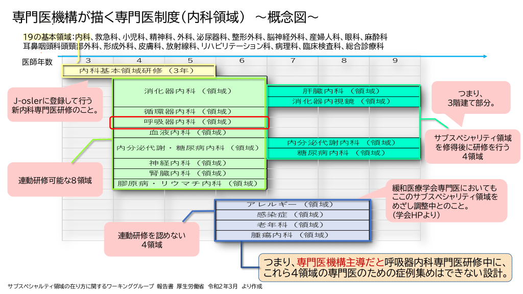 #15. 専門医機構が描く専門医制度(内科領域) ~概念図~ 19の基本領域:内科、救急科、小児科、精神科、外科、泌尿器科、整形外科、脳神経外科、産婦人科、眼科、麻酔科 耳鼻咽頭科頭頸部外科、形成外科、皮膚科、放射線科、リハビリテーション科、病理科、臨床検査科、総合診療科 医師年数 3 4 5 6 7 8 9 内科基本領域研修(3年) 消化器内科(領域) J-oslerに登録して行う 新内科専門医研修のこと。 肝臓内科(領域) 消化器内視鏡(領域) つまり、 3階建て部分。 循環器内科(領域) 呼吸器内科(領域) 血液内科(領域) 内分泌代謝・糖尿病内科(領域) 内分泌代謝内科(領域) 糖尿病内科(領域) 神経内科(領域) サブスペシャリティ領域 を修得後に研修を行う 4領域 腎臓内科(領域) 連動研修可能な8領域 膠原病・リウマチ内科(領域) アレルギー(領域) 感染症(領域) 緩和医療学会専門医においても ここのサブスペシャリティ領域を めざし調整中とのこと。 (学会HPより) 老年科(領域) 連動研修を認めない 4領域 腫瘍内科(領域) つまり、専門医機構主導だと呼吸器内科専門医研修中に、 これら4領域の専門医のための症例集めはできない設計。 サブスペシャルティ領域の在り方に関するワーキンググループ 報告書 厚生労働省 令和2年3月 より作成