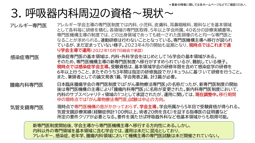 #16. *最新の情報に関しては各ホームページなどでご確認ください。 3. 呼吸器内科周辺の資格~現状~ アレルギー専門医 感染症専門医 アレルギー学会主導の専門医制度では内科、小児科、皮膚科、耳鼻咽喉科、眼科などを基本領域 として各科毎に研修を積む。各領域の専門医取得、5年以上学会所属、40名分の診療実績書等。 専門医機構主導の制度では、どの出身領域であっても統一された医師像のもと均一な専門医と なることが求められる。連動研修は行わないこととなっている。専門医機構主導へ移行が図られ ているが、まだ定まっていない様子。2023年4月の開始も延期となり、現時点ではこれまで通 り学会主導で運用(2022年10月7日総会で承認) 感染症専門医の基本領域は、内科・外科学会をはじめとして16学会の基本領域がある。 そのため、専門医機構主導の新専門医制度へ移行がすすめられているが、難航している様子。 現時点では感染症学会主導。受験資格は、基本領域学会の研修年限を含めて感染症学の研修を 6年以上行うこと、またそのうち3年間は指定の研修施設でカリキュラムに基づ いて研修を行うこと。 また、筆頭者としての論文発表1篇、学会発表2篇、計3篇が必要。 腫瘍内科専門医 日本臨床腫瘍学会の専門医制度では「がん薬物療法専門医」の名称だったが、新専門医制度の開始 後は専門医機構の主導により「腫瘍内科専門医」に名称が変更された。新内科専門医制度において、 内科のサブスペシャリティ領域の1つとして承認されたが、運用に関しては、現在調整中。移行期間 中の現時点では「がん薬物療法専門医」試験は中止の方向。 気管支鏡専門医 現時点で専門医機構の息がかかっておらず、学会主導。学会所属から5年目で受験資格が得られる。 気管支鏡診療実績(経験症例計100例以上,術者20例を含む)を証する指導医の証明書など 所定の要件クリアが必要となる。要件を満たせば呼吸器外科など他基本領域からも取得可能。 新専門医制度開始後、学会主導から専門医機構主導へ移行する方向性にある。しかし、 内科以外の専門領域を基本領域に含む学会では、運用は未だに混沌としており、 アレルギー、感染症、老年学、腫瘍内科領域において機構主導の専門医試験は未だ開催されていない。