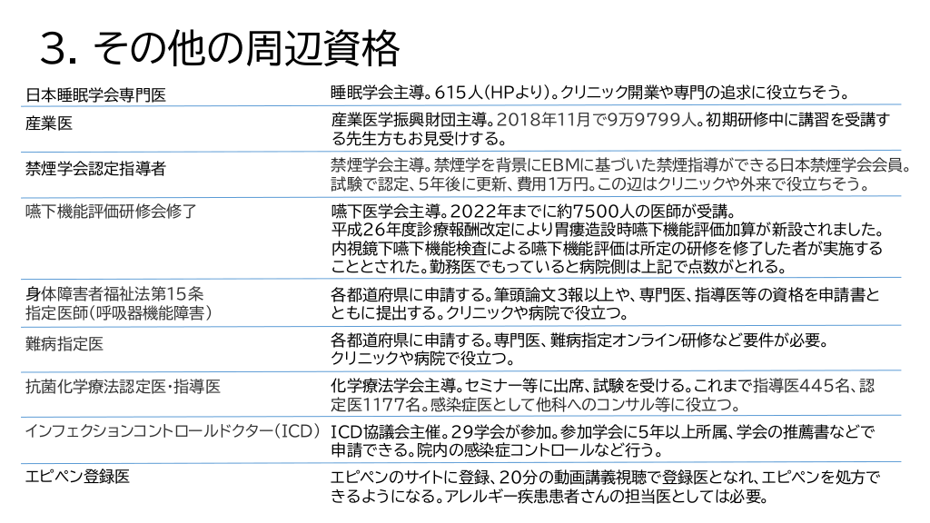 #17. 3. その他の周辺資格 日本睡眠学会専門医 睡眠学会主導。615人(HPより)。クリニック開業や専門の追求に役立ちそう。 産業医 産業医学振興財団主導。2018年11月で9万9799人。初期研修中に講習を受講す る先生方もお見受けする。 禁煙学会認定指導者 禁煙学会主導。禁煙学を背景にEBMに基づいた禁煙指導ができる日本禁煙学会会員。 試験で認定、5年後に更新、費用1万円。この辺はクリニックや外来で役立ちそう。 嚥下機能評価研修会修了 嚥下医学会主導。2022年までに約7500人の医師が受講。 平成26年度診療報酬改定により胃瘻造設時嚥下機能評価加算が新設されました。 内視鏡下嚥下機能検査による嚥下機能評価は所定の研修を修了した者が実施する こととされた。勤務医でもっていると病院側は上記で点数がとれる。 身体障害者福祉法第15条 指定医師(呼吸器機能障害) 各都道府県に申請する。筆頭論文3報以上や、専門医、指導医等の資格を申請書と ともに提出する。クリニックや病院で役立つ。 難病指定医 各都道府県に申請する。専門医、難病指定オンライン研修など要件が必要。 クリニックや病院で役立つ。 抗菌化学療法認定医・指導医 化学療法学会主導。セミナー等に出席、試験を受ける。これまで指導医445名、認 定医1177名。感染症医として他科へのコンサル等に役立つ。 インフェクションコントロールドクター(ICD) ICD協議会主催。29学会が参加。参加学会に5年以上所属、学会の推薦書などで 申請できる。院内の感染症コントロールなど行う。 エピペン登録医 エピペンのサイトに登録、20分の動画講義視聴で登録医となれ、エピペンを処方で きるようになる。アレルギー疾患患者さんの担当医としては必要。
