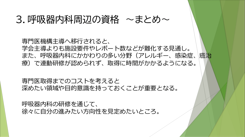 #18. 3.呼吸器内科周辺の資格 ~まとめ~ 専門医機構主導へ移行されると、 学会主導よりも施設要件やレポート数などが難化する見通し。 また、呼吸器内科にかかわりの多い分野(アレルギー、感染症、癌治 療)で連動研修が認められず、取得に時間がかかるようになる。 専門医取得までのコストを考えると 深めたい領域や目的意識を持っておくことが重要となる。 呼吸器内科の研修を通じて、 徐々に自分の進みたい方向性を見定めたいところ。