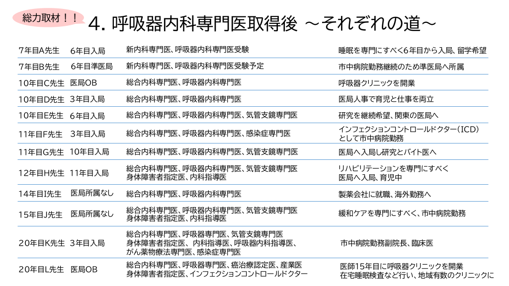 #19. 総力取材!! 4. 呼吸器内科専門医取得後 ~それぞれの道~ 7年目A先生 6年目入局 新内科専門医、呼吸器内科専門医受験 睡眠を専門にすべく6年目から入局、留学希望 7年目B先生 6年目準医局 新内科専門医、呼吸器内科専門医受験予定 市中病院勤務継続のため準医局へ所属 10年目C先生 医局OB 総合内科専門医、呼吸器内科専門医 呼吸器クリニックを開業 10年目D先生 3年目入局 総合内科専門医、呼吸器内科専門医 医局人事で育児と仕事を両立 10年目E先生 6年目入局 総合内科専門医、呼吸器内科専門医、気管支鏡専門医 研究を継続希望、関東の医局へ 総合内科専門医、呼吸器内科専門医、感染症専門医 インフェクションコントロールドクター(ICD) として市中病院勤務 11年目G先生 10年目入局 総合内科専門医、呼吸器内科専門医、気管支鏡専門医 医局へ入局し研究とバイト医へ 12年目H先生 11年目入局 総合内科専門医、呼吸器内科専門医、気管支鏡専門医 身体障害者指定医、内科指導医 リハビリテーションを専門にすべく 医局へ入局、育児中 11年目F先生 3年目入局 14年目I先生 医局所属なし 総合内科専門医、呼吸器内科専門医 製薬会社に就職、海外勤務へ 15年目J先生 医局所属なし 総合内科専門医、呼吸器内科専門医、気管支鏡専門医 身体障害者指定医、内科指導医 緩和ケアを専門にすべく、市中病院勤務 20年目K先生 3年目入局 総合内科専門医、呼吸器専門医、気管支鏡専門医 身体障害者指定医、 内科指導医、呼吸器内科指導医、 がん薬物療法専門医、感染症専門医 市中病院勤務副院長、臨床医 20年目L先生 医局OB 総合内科専門医、呼吸器専門医、癌治療認定医、産業医 身体障害者指定医、インフェクションコントロールドクター 医師15年目に呼吸器クリニックを開業 在宅睡眠検査など行い、地域有数のクリニックに