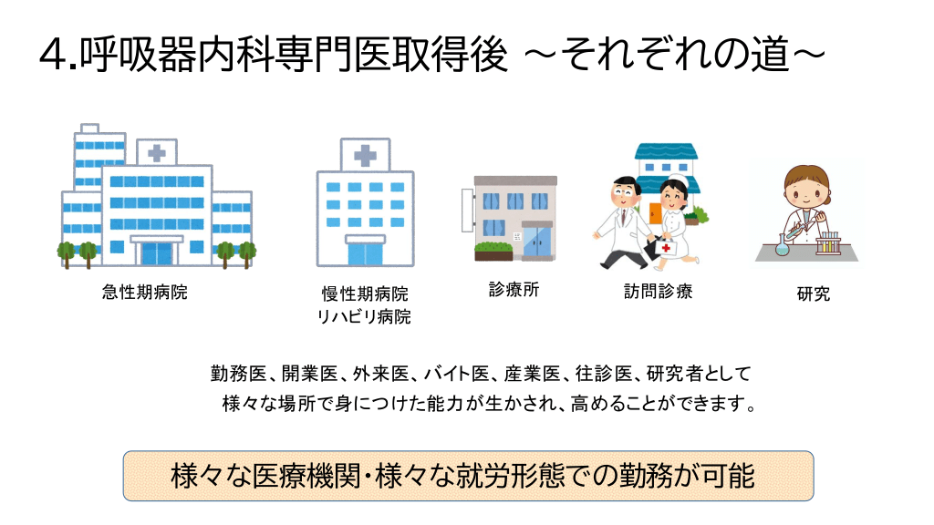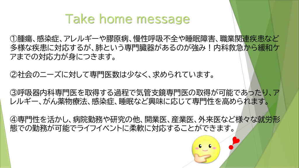#25. Take home message ①腫瘍、感染症、アレルギーや膠原病、慢性呼吸不全や睡眠障害、職業関連疾患など 多様な疾患に対応するが、肺という専門臓器があるのが強み!内科救急から緩和ケ アまでの対応力が身につきます。 ②社会のニーズに対して専門医数は少なく、求められています。 ③呼吸器内科専門医を取得する過程で気管支鏡専門医の取得が可能であったり、ア レルギー、がん薬物療法、感染症、睡眠など興味に応じて専門性を高められます。 ④専門性を活かし、病院勤務や研究の他、開業医、産業医、外来医など様々な就労形 態での勤務が可能でライフイベントに柔軟に対応することができます。