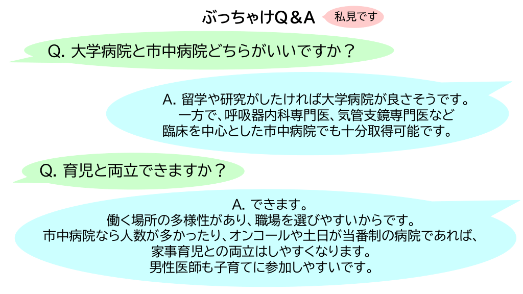 #21. ぶっちゃけQ&A 私見です Q. 大学病院と市中病院どちらがいいですか? A. 留学や研究がしたければ大学病院が良さそうです。 一方で、呼吸器内科専門医、気管支鏡専門医など 臨床を中心とした市中病院でも十分取得可能です。 Q. 育児と両立できますか? A. できます。 働く場所の多様性があり、職場を選びやすいからです。 市中病院なら人数が多かったり、オンコールや土日が当番制の病院であれば、 家事育児との両立はしやすくなります。 男性医師も子育てに参加しやすいです。