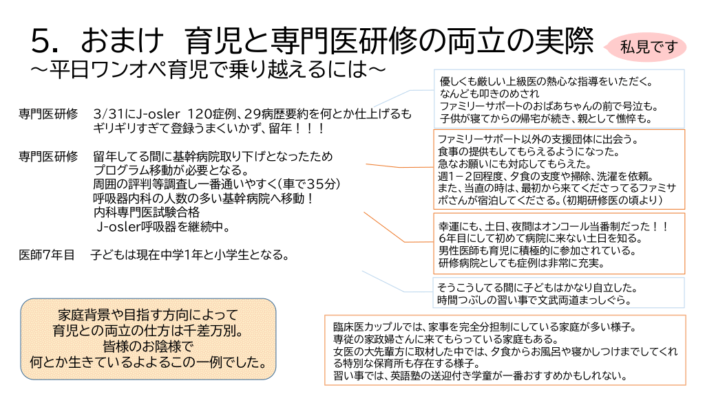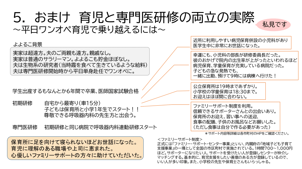 #22. 5. おまけ 育児と専門医研修の両立の実際 ~平日ワンオペ育児で乗り越えるには~ 私見です 近所に利用しやすい病児保育併設の小児科があり 医学生中に非常にお世話になった。 よよるこ背景 実家は超遠方。夫のご両親も遠方。親戚なし。 実家は普通のサラリーマン。よよるこも貯金ほぼなし。 夫は生物系の研究者(当時霞を食べて生きているような給料) 夫は専門医研修開始時から平日単身赴任でワンオペに。 学生出産するもなんとか6年間で卒業、医師国家試験合格 初期研修 自宅から最寄り(車15分) 子どもは保育所と小学1年生でスタート!! 尊敬できる呼吸器内科の先生方と出会う。 専門医研修 初期研修と同じ病院で呼吸器内科連動研修スタート 幸運にも、小児科の部長が研修委員長だった。 彼のおかげで院内の出生率が上がったといわれるほど 病児保育、学童保育が充実している病院だった。 子どもの急な発熱でも、 一緒に出勤、預けて9時には病棟へ行けた! 公立保育所は19時まであずかり。 小学校の学童保育は18:30まで。 お迎えはほぼ間に合わない。 ファミリーサポート制度を利用。 信頼できるサポーターさんとの出会いあり。 保育所のお迎え、習い事への送迎、 食事の配膳、子供のお風呂などお願いした。 (ただし食事は自分で作る必要があった) *サポート内容等詳細は各市町村のHPをご確認ください。 保育所に足を向けて寝られないほどお世話になった。 育児に理解のある職場や上司に恵まれた。 心優しいファミリーサポートの方々に助けていただいた。 <ファミリーサポート制度> 正式には「ファミリー・サポート・センター事業」といい、内閣府の「地域子ども子育て 支援事業」の一環として全国の市区町村で実施されている。1時間700~1,000円 ほど。サポーターになりたい人、サポートを受けたい人が登録しセンターが仲介し マッチングする。基本的に、育児支援をしたい善意のある方が登録しているので、 いい人が多い印象。また、小学校の先生や保育士さんもいらっしゃる。