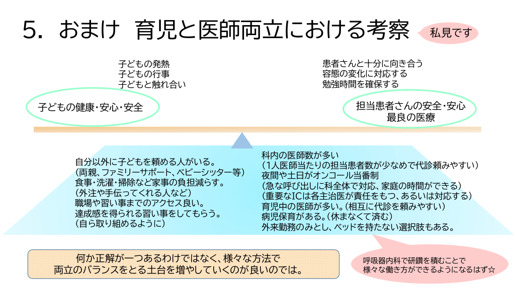 #24. 5. おまけ 育児と医師両立における考察 患者さんと十分に向き合う 容態の変化に対応する 勉強時間を確保する 子どもの発熱 子どもの行事 子どもと触れ合い 担当患者さんの安全・安心 最良の医療 子どもの健康・安心・安全 自分以外に子どもを頼める人がいる。 (両親、ファミリーサポート、ベビーシッター等) 食事・洗濯・掃除など家事の負担減らす。 (外注や手伝ってくれる人など) 職場や習い事までのアクセス良い。 達成感を得られる習い事をしてもらう。 (自ら取り組めるように) 私見です 科内の医師数が多い (1人医師当たりの担当患者数が少なめで代診頼みやすい) 夜間や土日がオンコール当番制 (急な呼び出しに科全体で対応、家庭の時間ができる) (重要なICは各主治医が責任をもつ、あるいは対応する) 育児中の医師が多い。(相互に代診を頼みやすい) 病児保育がある。(休まなくて済む) 外来勤務のみとし、ベッドを持たない選択肢もある。 何か正解が一つあるわけではなく、様々な方法で 両立のバランスをとる土台を増やしていくのが良いのでは。 呼吸器内科で研鑽を積むことで 様々な働き方ができるようになるはず☆