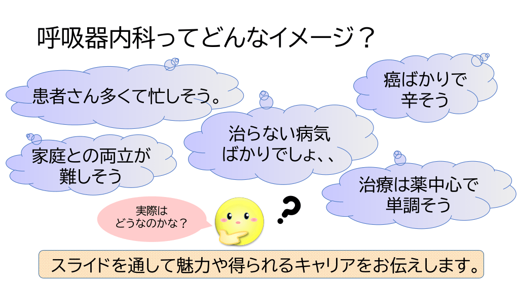#3. 呼吸器内科ってどんなイメージ? 患者さん多くて忙しそう。 家庭との両立が 難しそう 実際は どうなのかな? 癌ばかりで 辛そう 治らない病気 ばかりでしょ、、 治療は薬中心で 単調そう スライドを通して魅力や得られるキャリアをお伝えします。