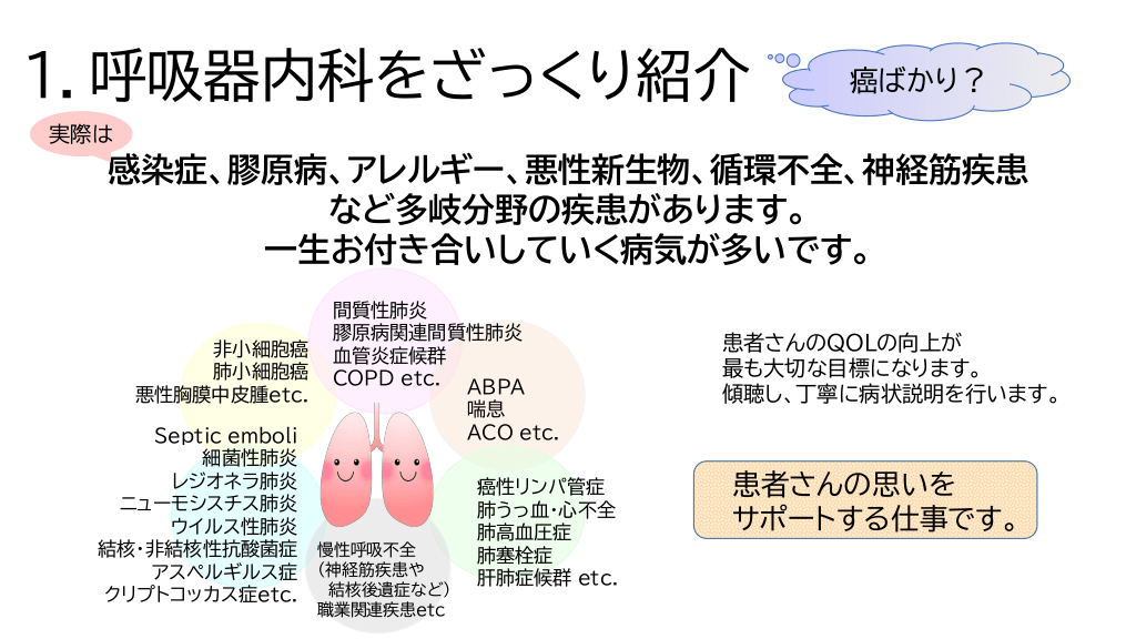 #6. 1.呼吸器内科をざっくり紹介 癌ばかり? 実際は 感染症、膠原病、アレルギー、悪性新生物、循環不全、神経筋疾患 など多岐分野の疾患があります。 一生お付き合いしていく病気が多いです。 非小細胞癌 肺小細胞癌 悪性胸膜中皮腫etc. Septic emboli 細菌性肺炎 レジオネラ肺炎 ニューモシスチス肺炎 ウイルス性肺炎 結核・非結核性抗酸菌症 アスペルギルス症 クリプトコッカス症etc. 間質性肺炎 膠原病関連間質性肺炎 血管炎症候群 COPD etc. ABPA 喘息 ACO etc. 慢性呼吸不全 (神経筋疾患や 結核後遺症など) 職業関連疾患etc 癌性リンパ管症 肺うっ血・心不全 肺高血圧症 肺塞栓症 肝肺症候群 etc. 患者さんのQOLの向上が 最も大切な目標になります。 傾聴し、丁寧に病状説明を行います。 患者さんの思いを サポートする仕事です。