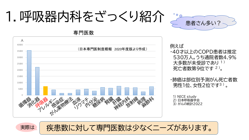 #8. 1.呼吸器内科をざっくり紹介 患者さん多い? 専門医数 人 40000 35000 30000 25000 20000 15000 10000 (日本専門医制度概報 2020年度版より作成) 例えば ・40才以上のCOPD患者は推定 530万人。うち通院者数4.9% 大多数が未受診であり 1 ) 死亡者数第9位です 2 )。 ・肺癌は部位別予測がん死亡者数 男性1位、女性2位です3 ) 。 5000 0 実際は 1) NICE study 2) 日本呼吸器学会 3) がんの統計2022 疾患数に対して専門医数は少なくニーズがあります。