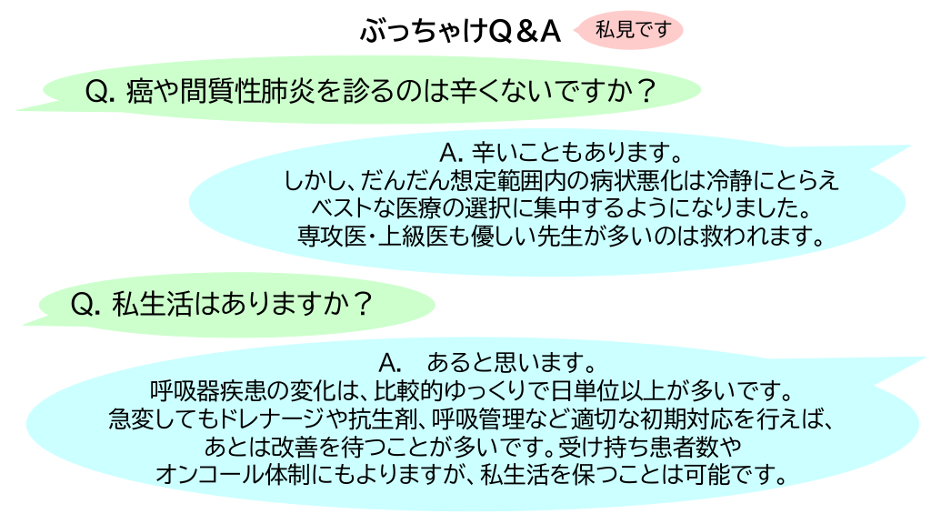 #9. ぶっちゃけQ&A 私見です Q. 癌や間質性肺炎を診るのは辛くないですか? A. 辛いこともあります。 しかし、だんだん想定範囲内の病状悪化は冷静にとらえ ベストな医療の選択に集中するようになりました。 専攻医・上級医も優しい先生が多いのは救われます。 Q. 私生活はありますか? A. あると思います。 呼吸器疾患の変化は、比較的ゆっくりで日単位以上が多いです。 急変してもドレナージや抗生剤、呼吸管理など適切な初期対応を行えば、 あとは改善を待つことが多いです。受け持ち患者数や オンコール体制にもよりますが、私生活を保つことは可能です。