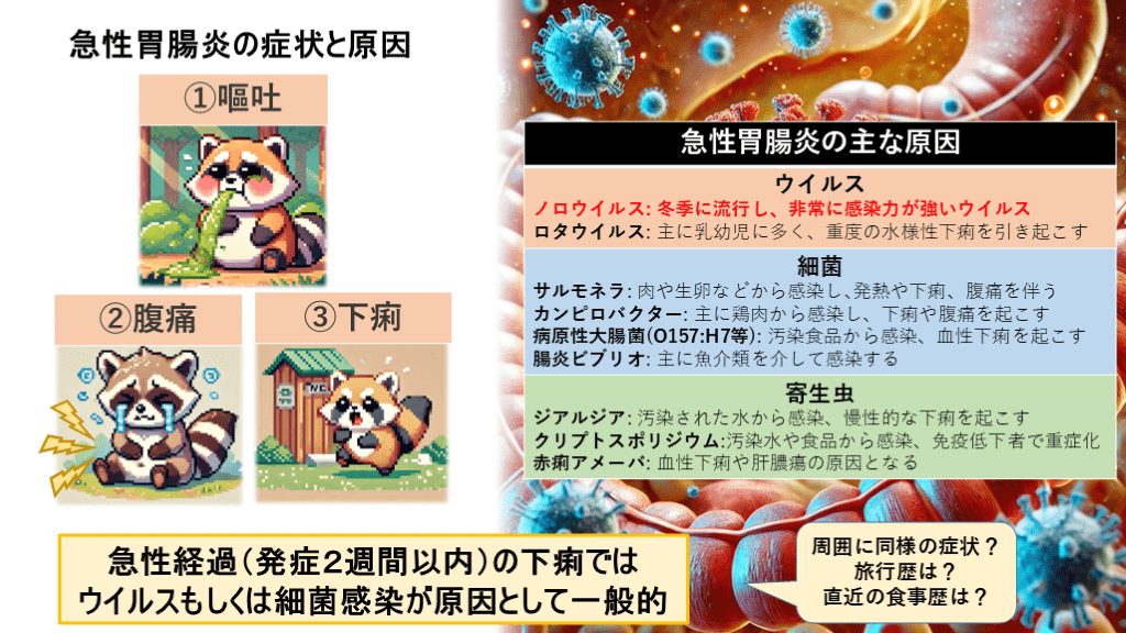 #5. 急性経過(発症2週間以内)の下痢ではウイルスもしくは細菌感染が原因として一般的 急性胃腸炎の症状と原因 ①嘔吐 ②腹痛 ③下痢 周囲に同様の症状?旅行歴は?