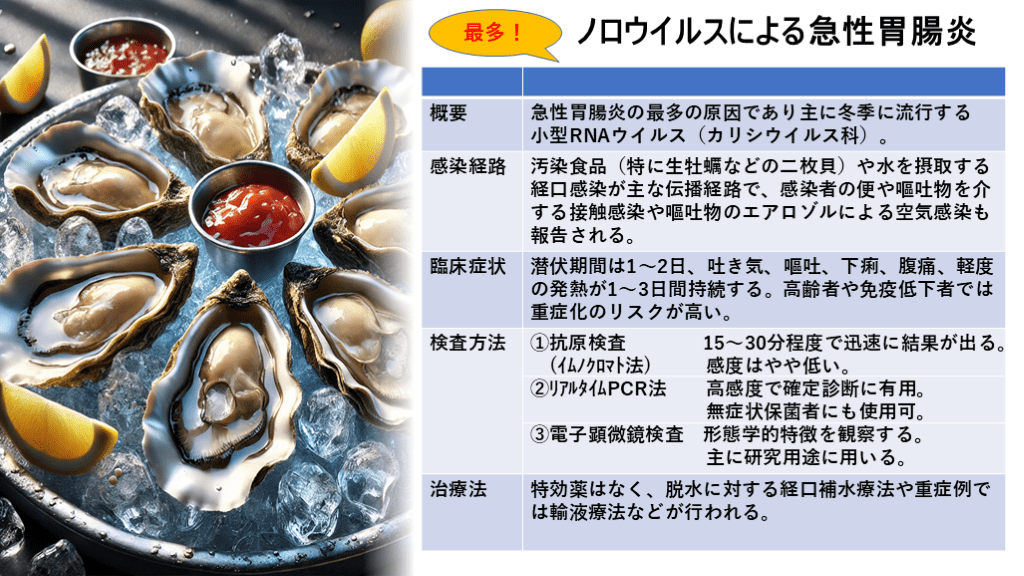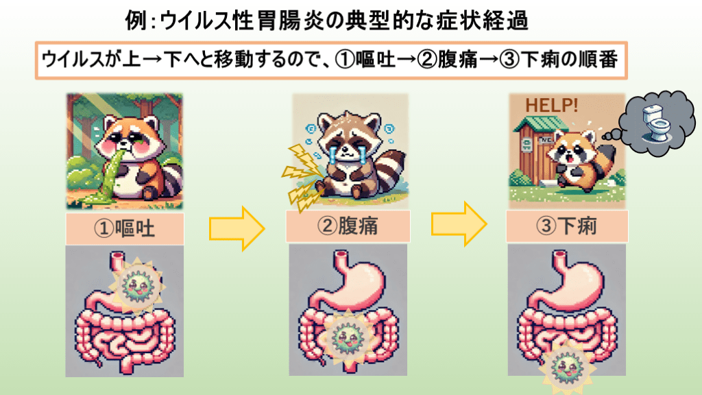ウイルスが上→下へと移動するので、①嘔吐→②腹痛→③下痢の順番