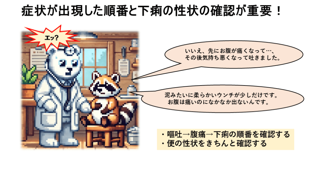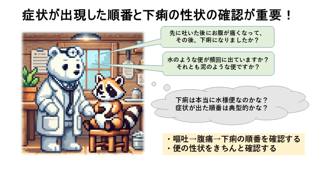 症状が出た順番は典型的かな? 症状が出現した順番と下痢の性状の確認が重要! 水のような便が頻回に出ていますか?