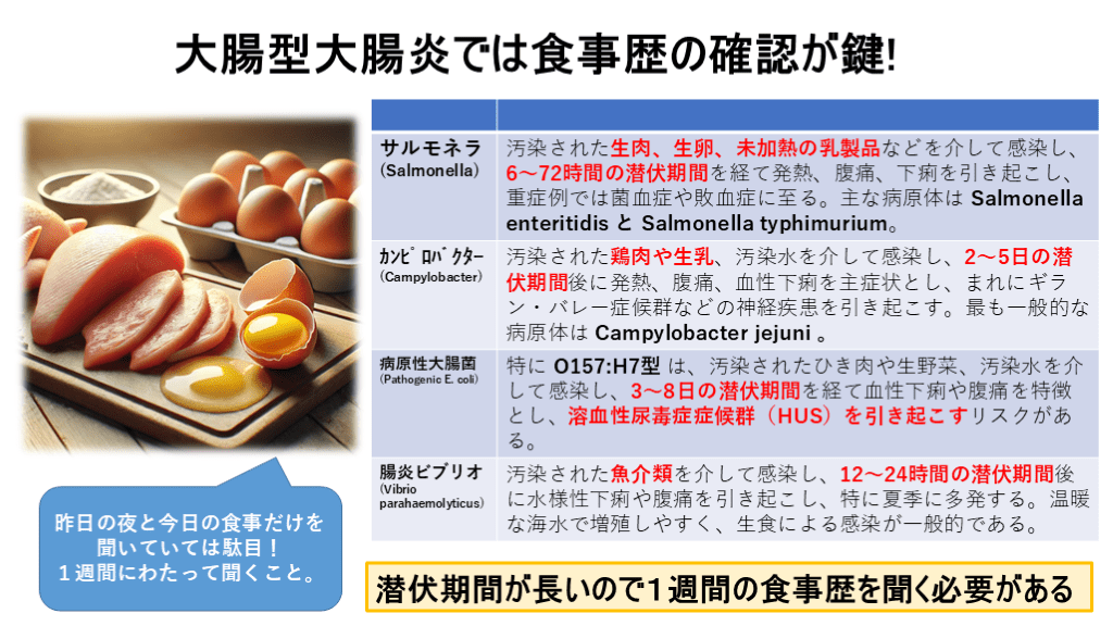 #15. 大腸型大腸炎では食事歴の確認が鍵! 潜伏期間が長いので1週間の食事歴を聞く必要がある 昨日の夜と今日の食事だけを聞いていては駄目!