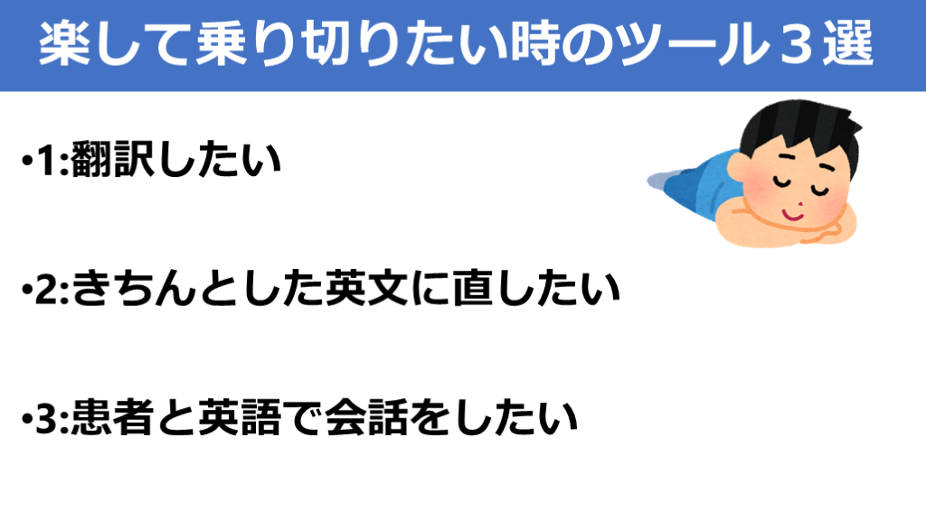 医療者は英語で困る場面に時々出くわします。楽して英語を乗り切りたい人が、「翻訳したい」「きちんとした英文にしたい」「患者と英語で会話をしたい」という時に役立つツールを3つ、英語の勉強を頑張りたい人が、「英単語を覚えたい」「リスリングを鍛えたい」「きれいな発音になりたい」「ペラペラになりたい」「3日坊主を防止したい」時に使えるツールを5つご紹介します。