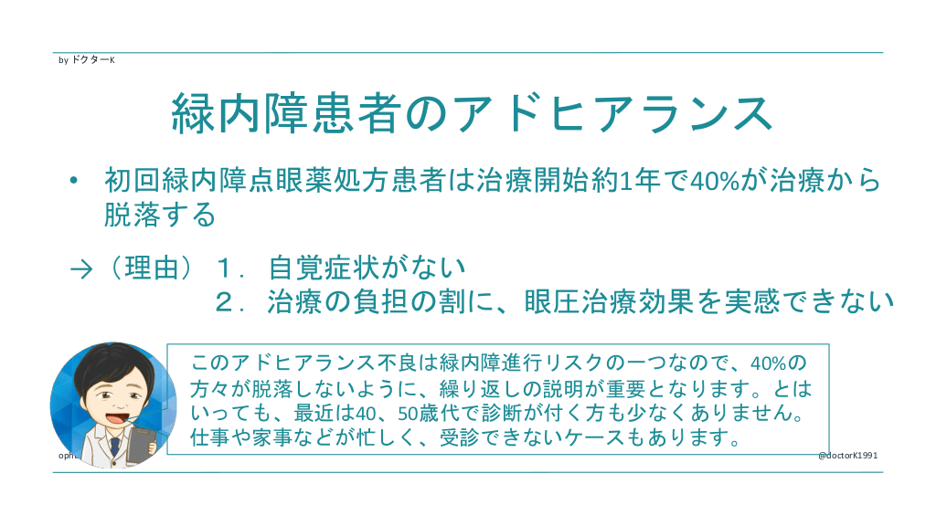 #10. by ドクターK 緑内障患者のアドヒアランス • 初回緑内障点眼薬処方患者は治療開始約1年で40%が治療から 脱落する →(理由)1.自覚症状がない 2.治療の負担の割に、眼圧治療効果を実感できない このアドヒアランス不良は緑内障進行リスクの一つなので、40%の 方々が脱落しないように、繰り返しの説明が重要となります。とは いっても、最近は40、50歳代で診断が付く方も少なくありません。 仕事や家事などが忙しく、受診できないケースもあります。 ophthalmology @doctorK1991