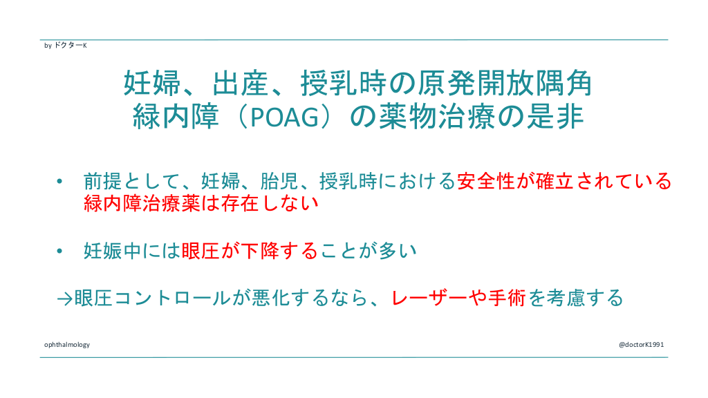 #11. by ドクターK 妊婦、出産、授乳時の原発開放隅角 緑内障(POAG)の薬物治療の是非 • 前提として、妊婦、胎児、授乳時における安全性が確立されている 緑内障治療薬は存在しない • 妊娠中には眼圧が下降することが多い →眼圧コントロールが悪化するなら、レーザーや手術を考慮する ophthalmology @doctorK1991