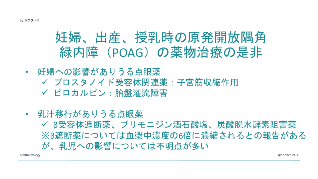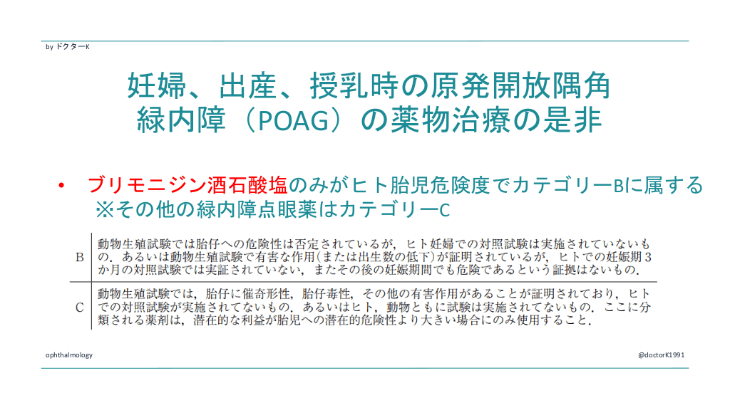 #12. by ドクターK 妊婦、出産、授乳時の原発開放隅角 緑内障(POAG)の薬物治療の是非 • ブリモニジン酒石酸塩のみがヒト胎児危険度でカテゴリーBに属する ※その他の緑内障点眼薬はカテゴリーC ophthalmology @doctorK1991
