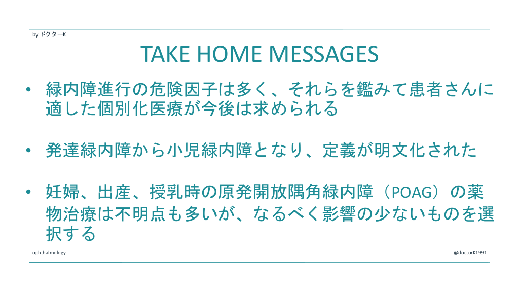 #2. by ドクターK TAKE HOME MESSAGES • 緑内障進行の危険因子は多く、それらを鑑みて患者さんに 適した個別化医療が今後は求められる • 発達緑内障から小児緑内障となり、定義が明文化された • 妊婦、出産、授乳時の原発開放隅角緑内障(POAG)の薬 物治療は不明点も多いが、なるべく影響の少ないものを選 択する ophthalmology @doctorK1991