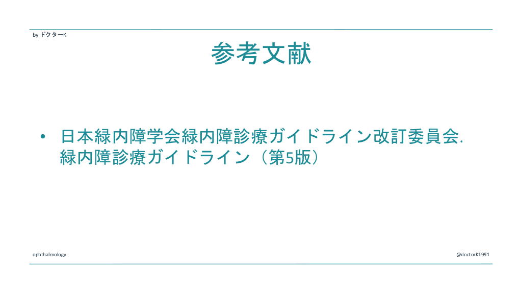 #15. by ドクターK 参考文献 • 日本緑内障学会緑内障診療ガイドライン改訂委員会. 緑内障診療ガイドライン(第5版) ophthalmology @doctorK1991