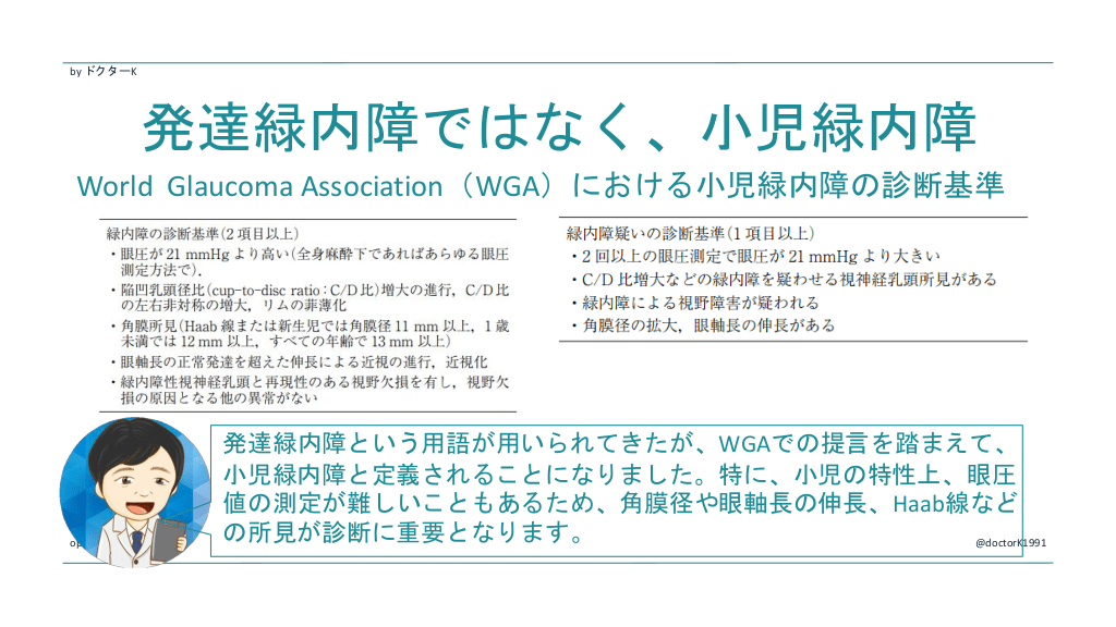 #7. by ドクターK 発達緑内障ではなく、小児緑内障 World Glaucoma Association(WGA)における小児緑内障の診断基準 ophthalmology 発達緑内障という用語が用いられてきたが、WGAでの提言を踏まえて、 小児緑内障と定義されることになりました。特に、小児の特性上、眼圧 値の測定が難しいこともあるため、角膜径や眼軸長の伸長、Haab線など の所見が診断に重要となります。 @doctorK1991