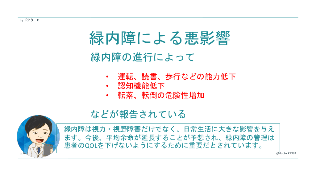 #9. by ドクターK 緑内障による悪影響 緑内障の進行によって • • • 運転、読書、歩行などの能力低下 認知機能低下 転落、転倒の危険性増加 などが報告されている 緑内障は視力・視野障害だけでなく、日常生活に大きな影響を与え ます。今後、平均余命が延長することが予想され、緑内障の管理は 患者のQOLを下げないようにするために重要だとされています。 ophthalmology @doctorK1991