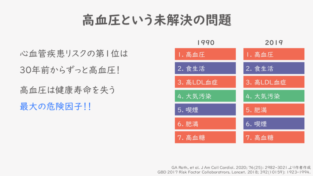 #5. 心血管疾患リスクの第1位は30年前からずっと高血圧! 1. 高血圧 2. 食生活 3. 高LDL血症 4. 大気汚染 5. 喫煙 6. 肥満 7. 高血糖 1990 1. 高血圧 2. 食生活 3. 高LDL血症 4. 大気汚染 6. 喫煙 5. 肥満 7. 高血糖 2019 GA Roth, et al. J Am Coll Cardiol. 2020; 76(25): 2982-3021.より作者作成