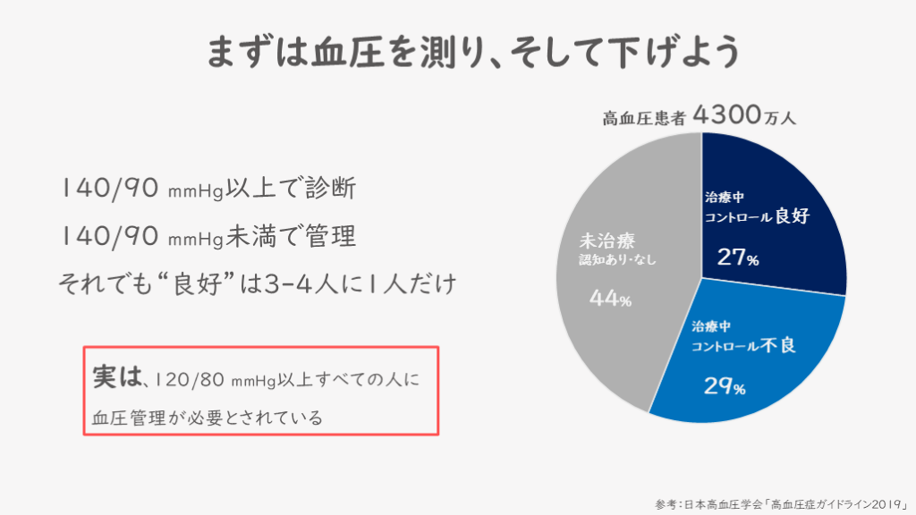 血圧管理が必要とされている まずは血圧を測り、そして下げよう 140/90 mmHg以上で診断140/90 mmHg未満で管理それでも“良好”は3-4人に1人だけ