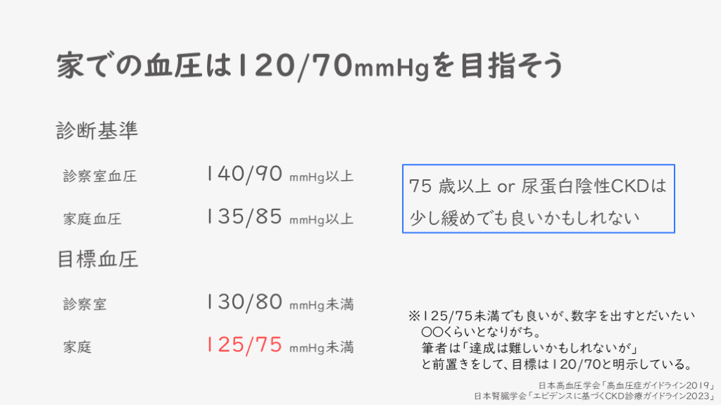 125/75 mmHg未満 ※125/75未満でも良いが、数字を出すとだいたい