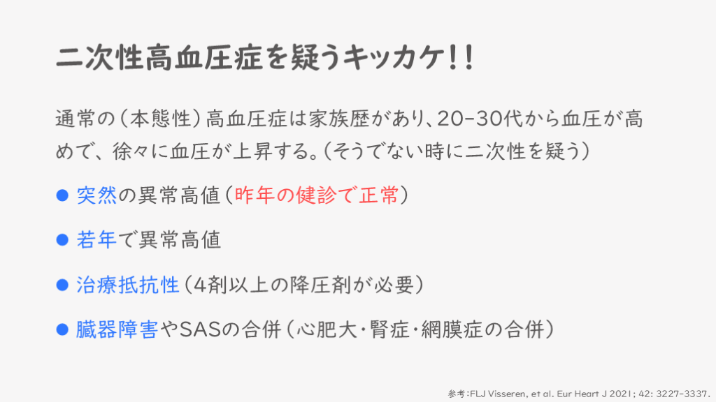 #9. 二次性高血圧症を疑うキッカケ!! 通常の(本態性)高血圧症は家族歴があり、20-30代から血圧が高めで、 徐々に血圧が上昇する。(そうでない時に二次性を疑う)