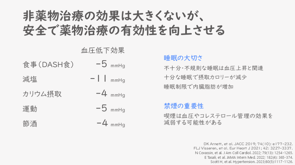 Scott H, et al. Hypertension. 2023;80(5):1117-1126. 非薬物治療の効果は大きくないが、安全で薬物治療の有効性を向上させる