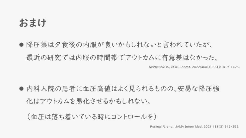 #13. おまけ 降圧薬は夕食後の内服が良いかもしれないと言われていたが、最近の研究では内服の時間帯でアウトカムに有意差はなかった。