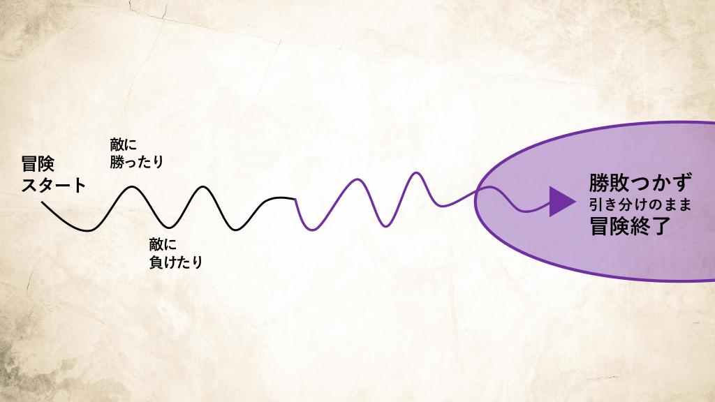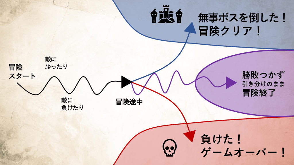 #11. 無事ボスを倒した! 冒険クリア! 冒険 スタート  敵に 勝ったり  勝敗つかず 引き分けのまま  冒険終了 敵に 負けたり  冒険途中  負けた! ゲームオーバー!