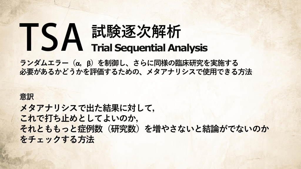 #5. 試験逐次解析 Trial Sequential Analysis ランダムエラー(α,β)を制御し、さらに同様の臨床研究を実施する 必要があるかどうかを評価するための、メタアナリシスで使用できる方法 意訳  メタアナリシスで出た結果に対して, これで打ち止めとしてよいのか, それとももっと症例数(研究数)を増やさないと結論がでないのか をチェックする方法