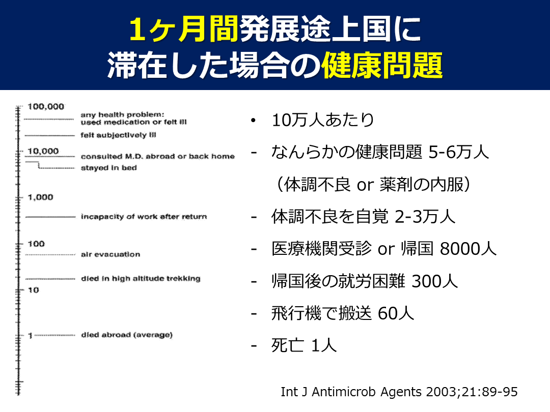 死亡 1人 1ヶ月間発展途上国に滞在した場合の健康問題 Int J Antimicrob Agents 2003;21:89-95