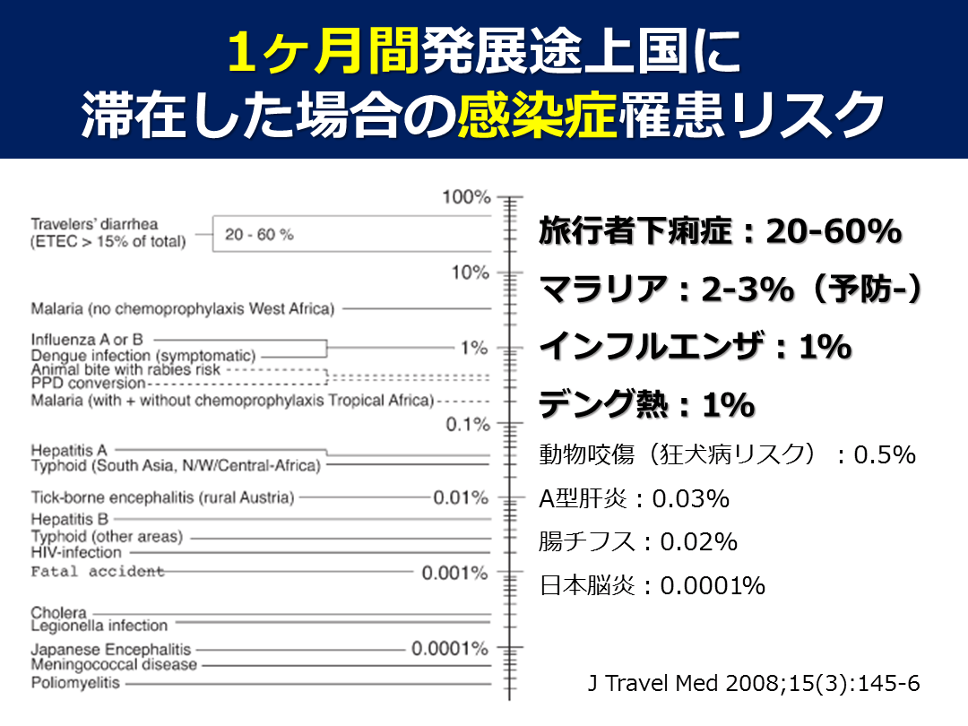 #15. 1ヶ月間発展途上国に滞在した場合の感染症罹患リスク J Travel Med 2008;15(3):145-6 旅行者下痢症:20-60%