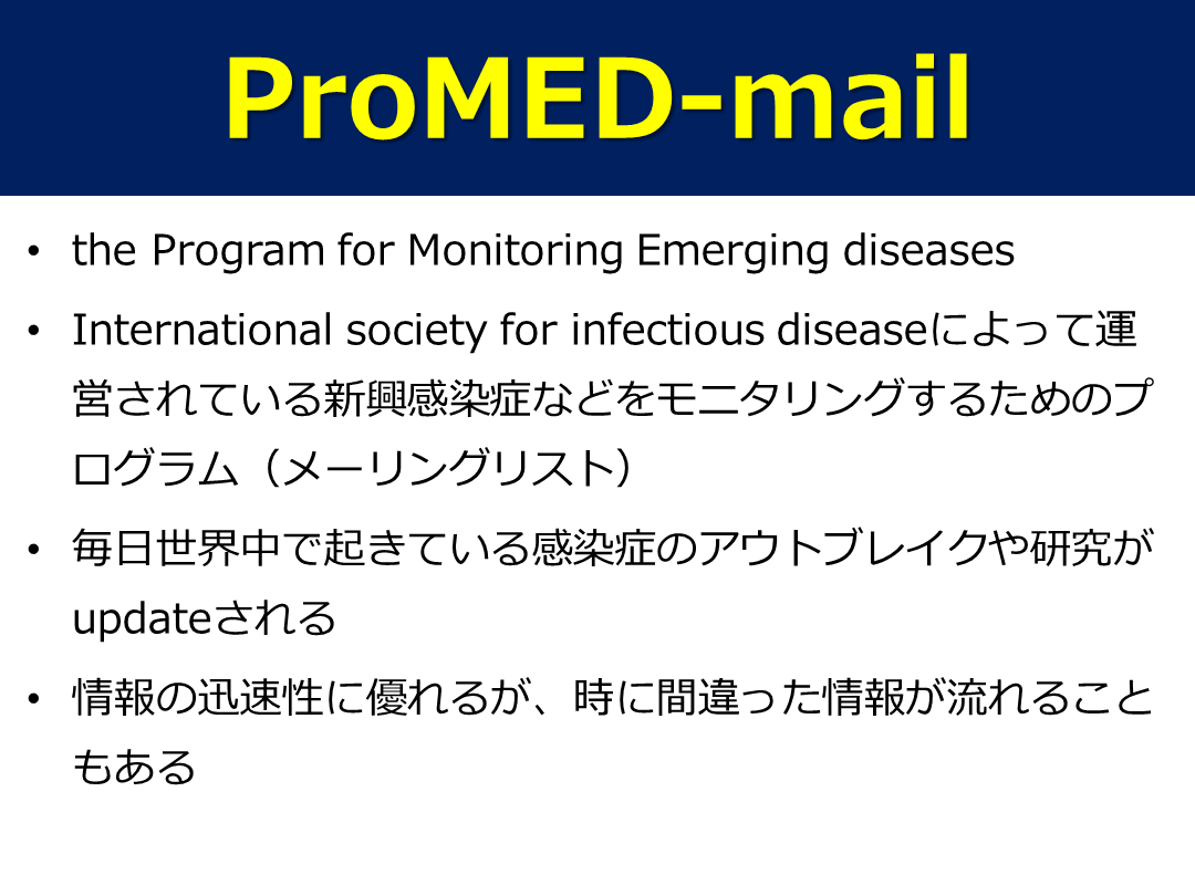 International society for infectious diseaseによって運営されている新興感染症などをモニタリングするためのプログラム(メーリングリスト)